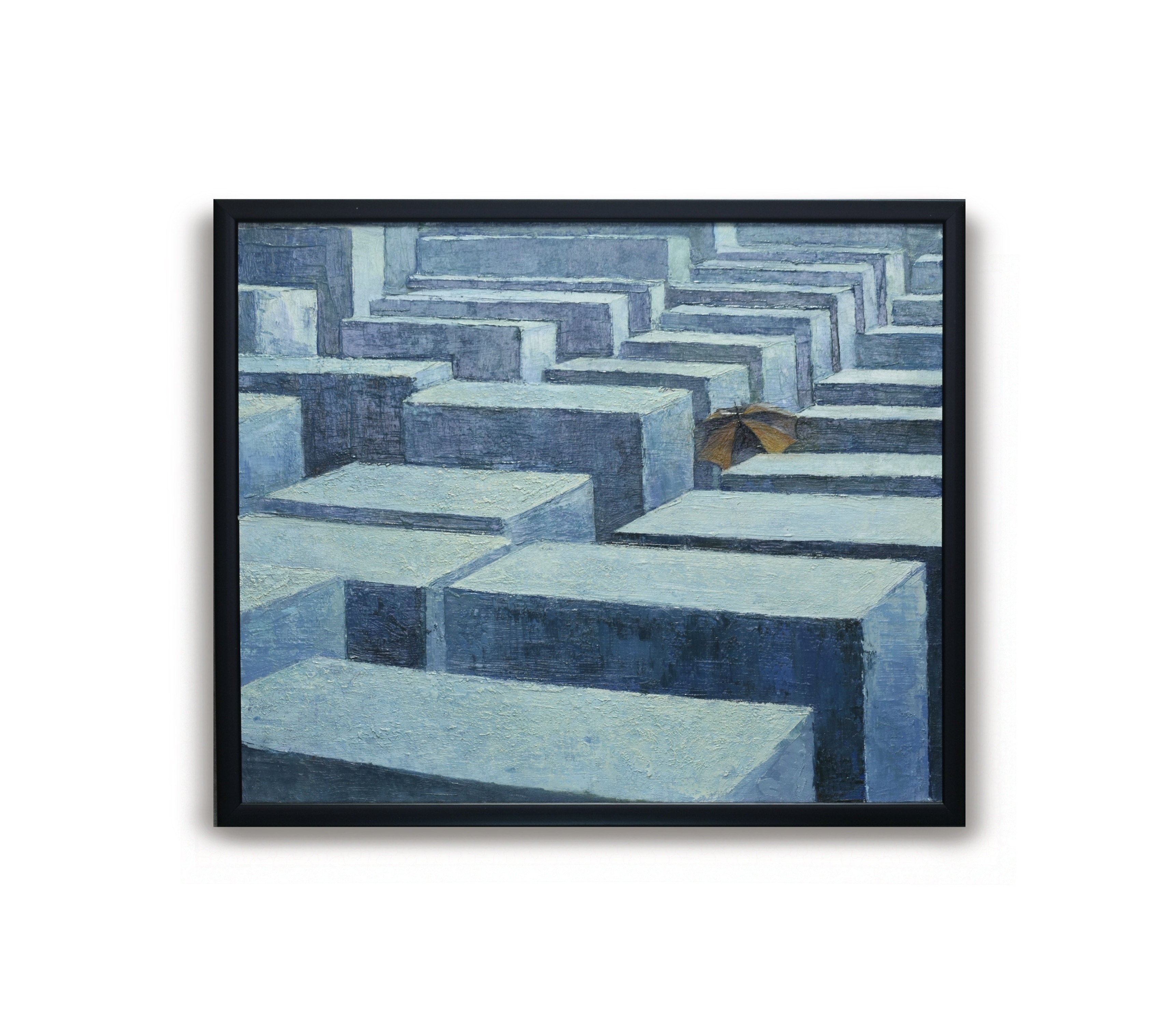 На картине изображен Мемориал убитым евреям Европы в Берлине. Человек идёт между каменными плитами скорби, прикрываясь зонтом от непогоды. Мы точно не знаем, кто этот человек. Возможно, он/она пережила Холокост. Возможно, это его/её внук-еврей. Возможно, он немец, которому небезразличны общечеловеческие ценности. А трогает ли пепел Холокоста ваше сердце? Помните ли вы библейский стих (Псалом 22:4)? В Торе сказано: «Даже когда я иду по долине тьмы, я не убоюсь зла, ибо Ты со мной; Твой жезл и Твой посох — они утешают меня».