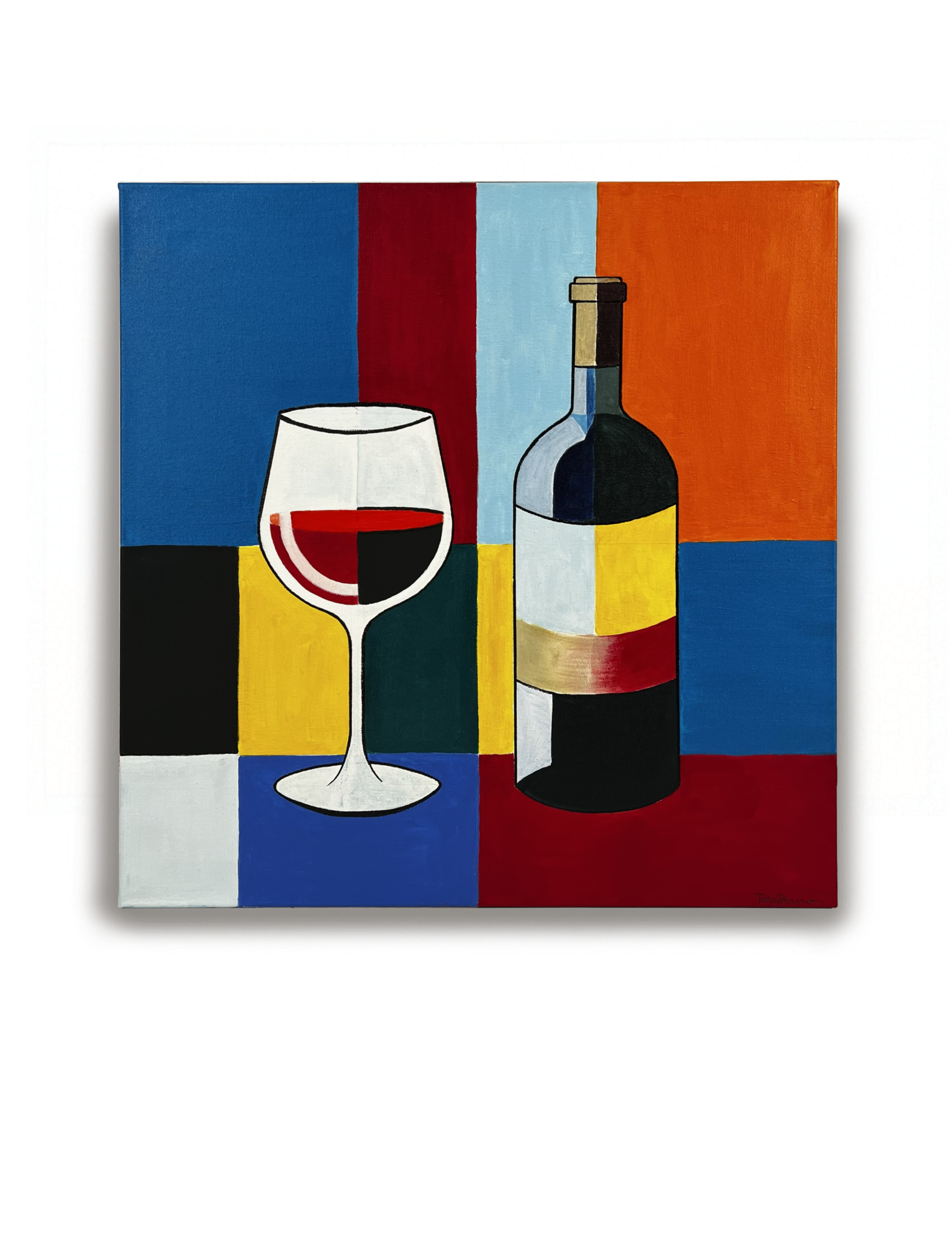 «Винная вибрация» — картина, выполненная акрилом в стиле абстракционизма. На ней изображены бокал и бутылка вина на фоне ярких геометрических форм. Произведение символизирует уют, наслаждение жизнью и простыми земными удовольствиями.