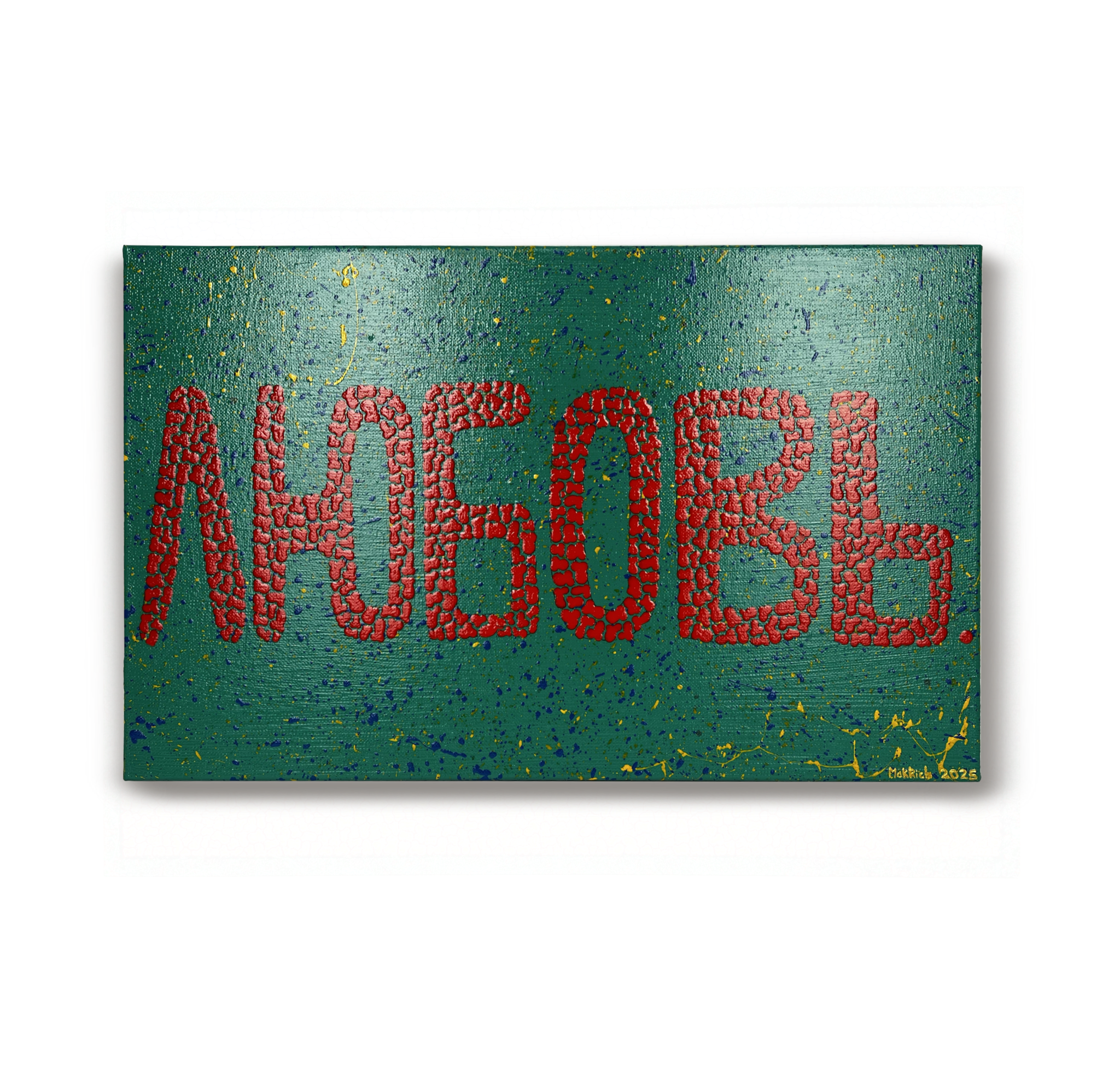 На картине ярко-красным цветом выделено слово «Любовь». Сейчас я нахожусь в прекрасных отношениях, но признаться любимой женщине словами «я люблю тебя» для меня непросто — в этом есть и волнение, и страх. Поэтому я решил выразить свои чувства на холсте. Пусть эта работа дарит радость каждому, кто на неё смотрит.