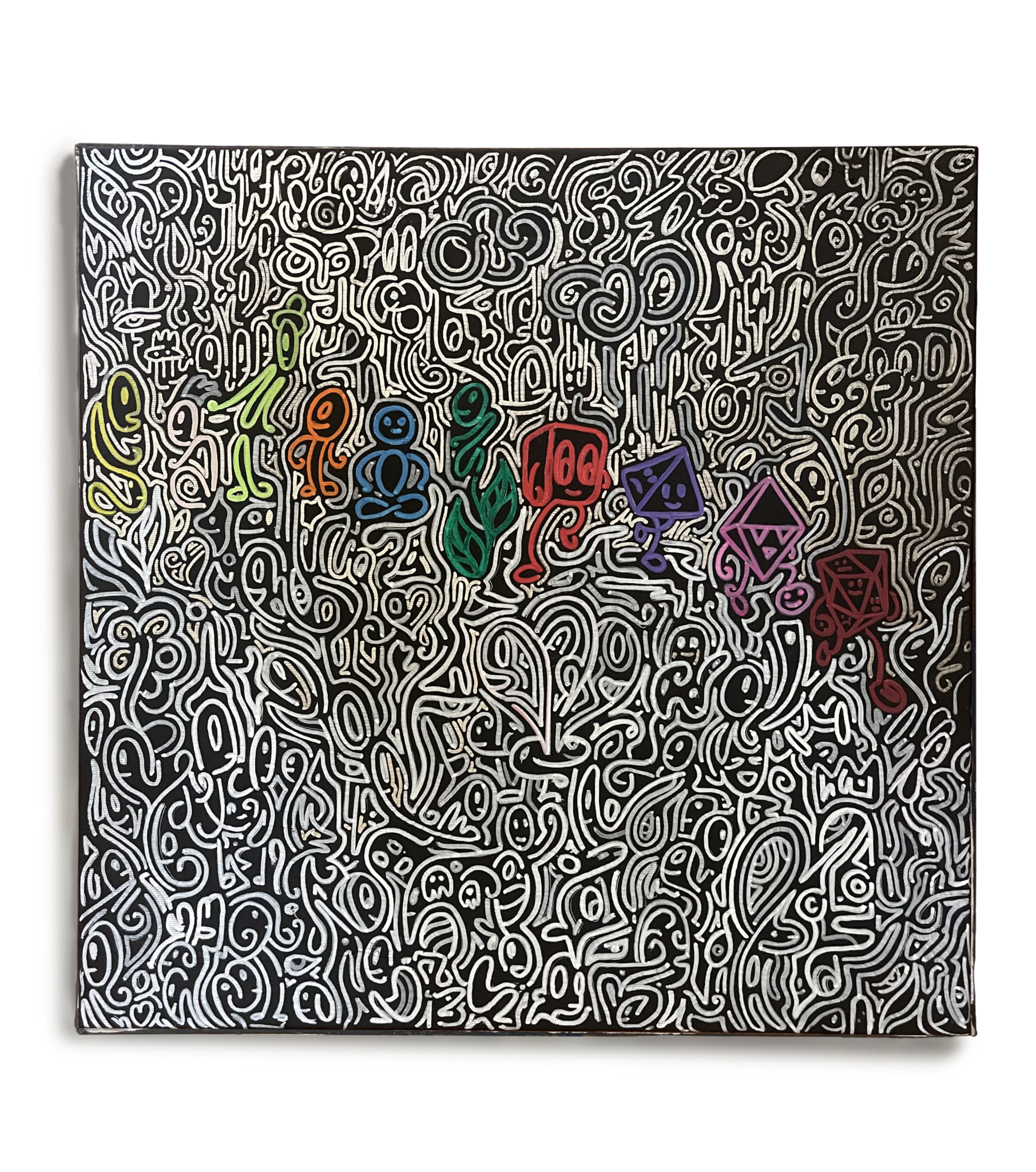 Однако в центре выделяются десять фигур — они отличаются цветом и формой, символизируя тех немногих, кто выбрал свой путь, непохожий на других, и благодаря этому стал уникальным.