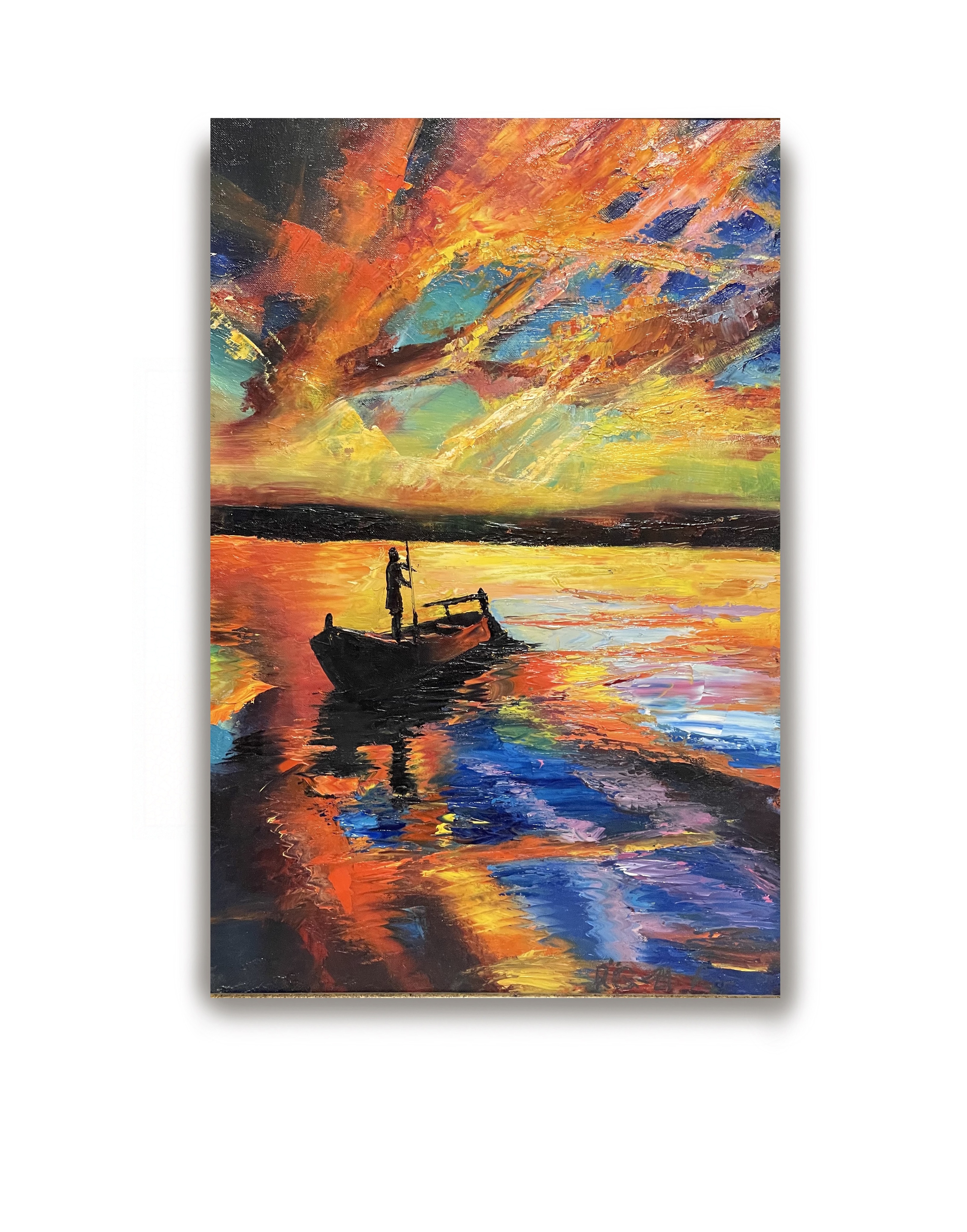 Одна из первых работ, выполненная мастихином. И взялась я за нее, потому что увидела безумное количество смешения красок,. И лодочника, который уже привык наблюдать за проявлением красоты в природе.