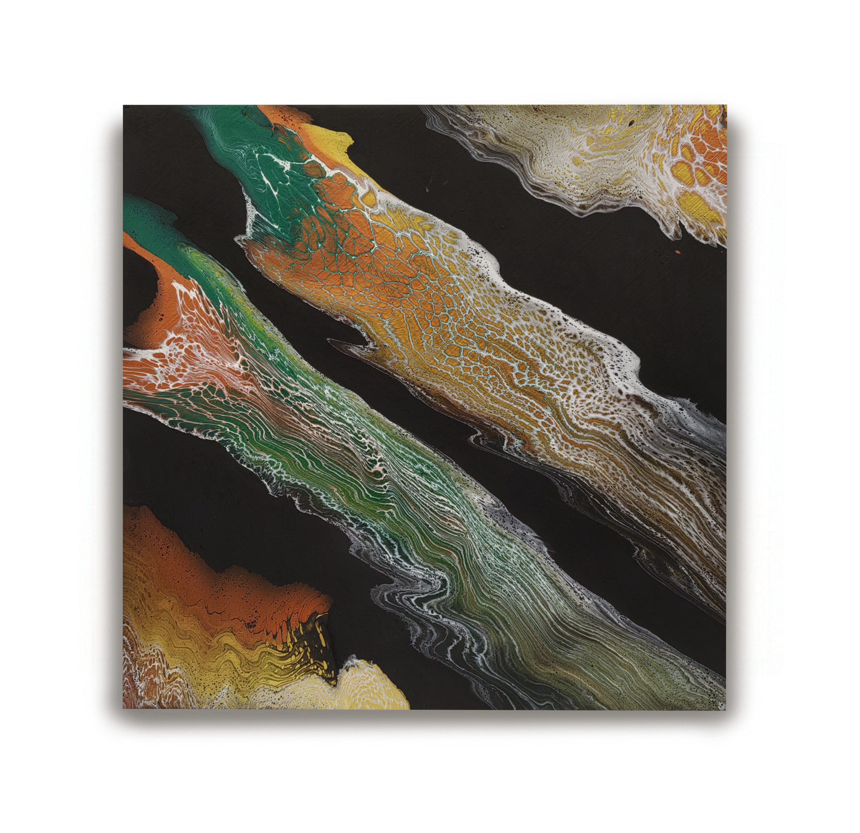 Выразительная абстрактная композиция, выполненная в технике акрилового флюид-арта. Контрастный черный фон усиливает впечатление «прорыва» цветовых потоков, среди которых преобладают землистые, малахитовые и коралловые оттенки. Сложная клеточная текстура и мягкие переходы создают эффект объемного, почти трёхмерного пространства.
