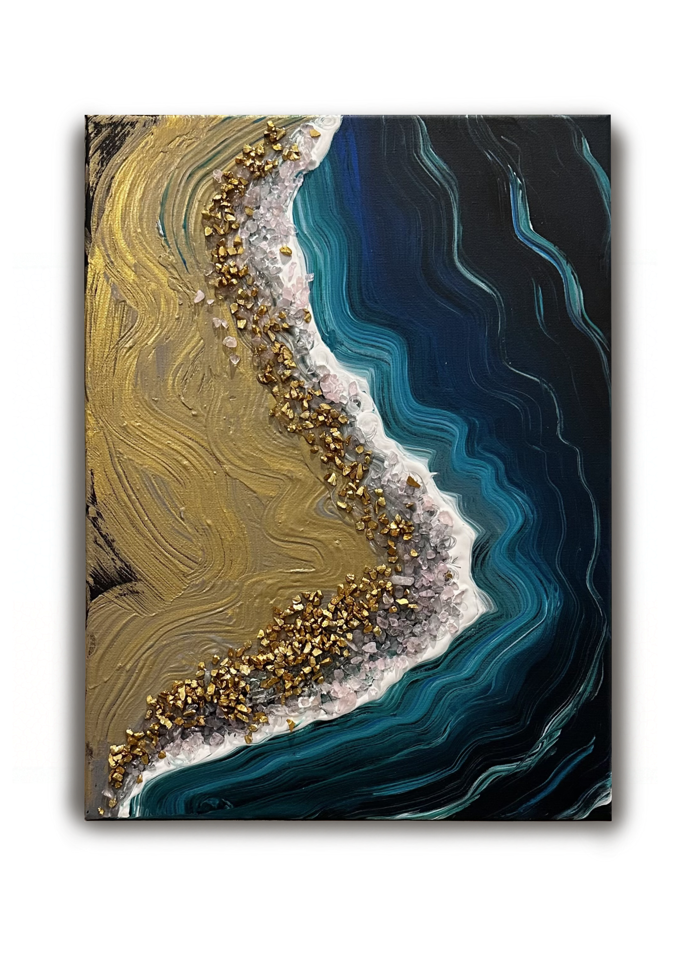 Холст, акрил, камни - розовый кварц, стеклянная золотая крошка.
